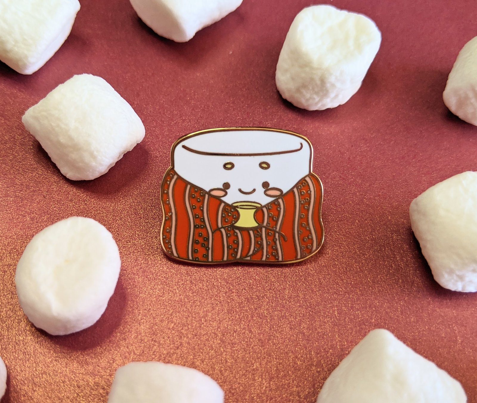 An enamel pin of a cozy marshmallow from our holiday series.