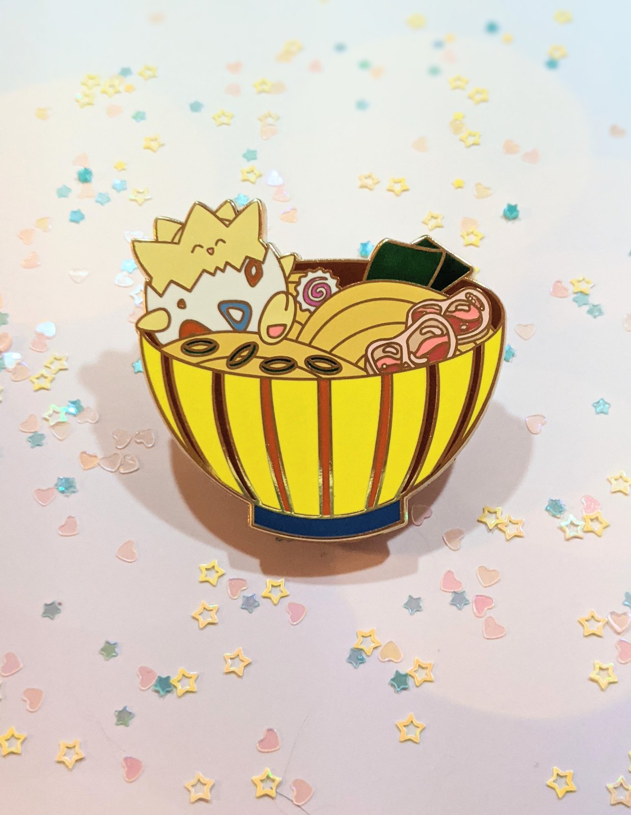 An enamel pin featuring a popular character in a ramen bowl from our fanart series.